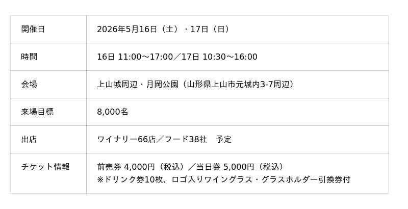 山形ワインバル実行委員会(所在地:山形県上山市)は、2026年5月16日(土)・17日(日)に山形県上山市で開催する日本最大級の屋外ワインイベント「山形ワインバル2026」の翌日、5月18日(月)限定で、ぶどう畑やワイナリーを巡りながら生産者と交流し、現地でワインを味わう特別企画「かみのやまワイナリーツアー」を実施します。