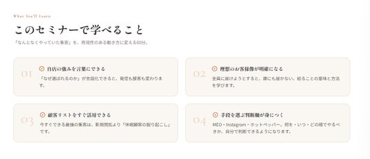 本セミナーは、SNS投稿やMEO対策といった「手段」に走る前に不可欠な「マーケティングの土台」を、講義とワーク形式で構築する実践型プログラムです。