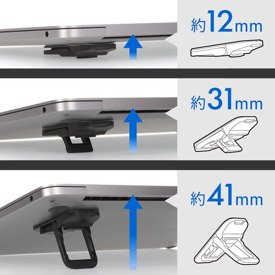 貼り付けて使用できる薄型スタンドノートPC本体背面に貼り付けたまま使用できる薄型スタンドです。3段階の高さ調整に対応し、通気性に配慮した設計を採用しています。折りたたみ時は薄くコンパクトになり、携帯性にも優れています。