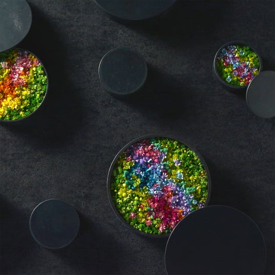 そっと開ける愉しみ、そして蓋を閉じ、秘める悦び。 小花で作られた花畑を、鉄作家による蓋付きの容れ物に閉じ込めたシリーズ。 漆黒の容器は蜜蝋仕上げのマットな質感で、鉄素材の重みを感じながら蓋を開けると、目にも鮮やかな景色が浮かび上がります。 蓋を開ける行為が気持ちを整える、手のひらの宝箱です。素材:鉄(蜜蝋仕上げ)、カラードライフラワー、プリザーブドフラワー