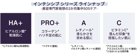 インテンシブシリーズは、美容専門家発想の肌のSOS サインと深く向き合う2 か月集中ケア。季節や環境の変化により、肌にいつもと異なるサインを感じたときに。