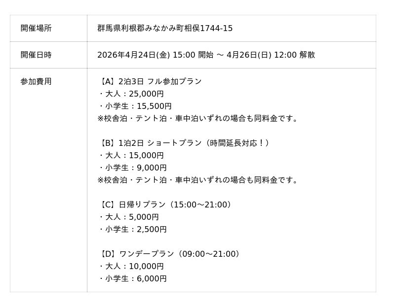 ■日程:2026年4月24日(金) 15:00 開始 ~ 4月26日(日) 12:00 解散