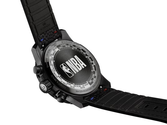 レザー×ラバーのストラップはボールの質感を再現し、赤青ステッチでアクセントを追加。さらに裏蓋にはNBAロゴと全チーム由来の都市・州が刻まれ、細部までバスケットボールの世界観を表現しているタイムピースです。