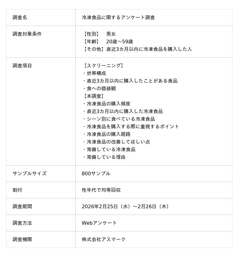 本調査では、「直近3カ月間で購入した冷凍食品」や「冷凍食品の購入時の重視点」、「シーン別に食べられている冷凍食品」などを明らかにすることを目的としています。