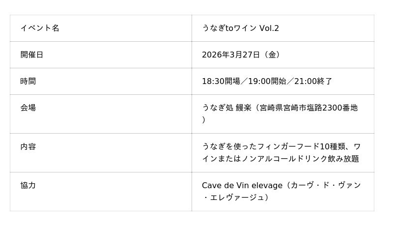 株式会社鰻楽(本社:宮崎県宮崎市、代表取締役社長:大森龍太郎)は、2026年3月27日、うなぎ処 鰻楽(宮崎県宮崎市)にて、イベント「うなぎtoワイン Vol.2」を開催いたしました。