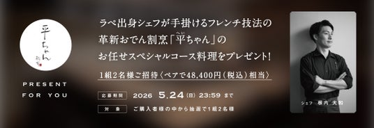 お店の味を楽しんでいただけるよう、定期的に参画飲食店の「コース料理プレゼントキャンペーン」を実施しております。今回は日本橋にあるイノベーティブフレンチおでん料理の「平ちゃん」のコース料理を商品ご購入者様の中から当選者へプレゼントいたします。世界が認める星付きフレンチレストラン「La Paix」の姉妹店である平ちゃんの「おまかせスペシャルコース」です。「平ちゃんコースプレゼント参加券」をカートに入れて、その他商品をご購入いただければキャンペーンにご応募いただけます。