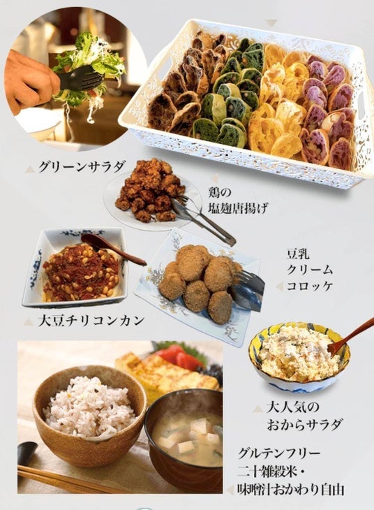 ご好評いただいているバイキングは、益々充実したラインナップ!五ケ山豆腐自慢のこだわりの豆腐はもちろんのこと、お子様から大人まで大人気の鶏の塩麹唐揚げ、 豆乳クリームコロッケ、そして大人気の豆乳もっちりんも食べ放題です!さらに、 自家農園の新鮮野菜サラダに、ドリンクコーナーにはしぼりたての濃厚な豆乳に加えおから茶とオレンジも飲み放題、食後のひとときをより一層豊かにします。そしてグルテンフリー二十雑穀米も嬉しい食べ放題、出汁からとった美味しい味噌汁もおかわり自由です。このバイキングメニューが3つの御膳とキッズメニューに付帯します。