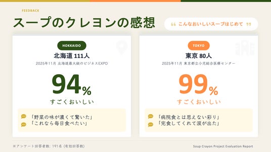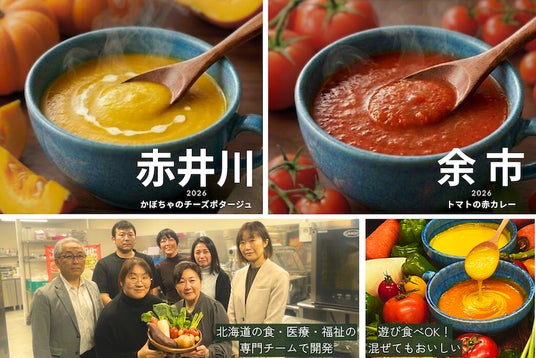 本製品は、北海道の医療・農業・福祉・食の専門家が連携した「医・福・農・食モデル」のもと開発。2025年の試食会では北海道・東京合計191名が参加し、94~99%が「すごくおいしい」と回答。4月中に公式ラインに登録いただくと200名限定のソーシャルイベント「Soup for2」に参加いただけます。
