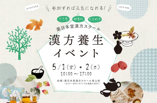スギホールディングス株式会社の子会社である薬日本堂株式会社(本社:東京都千代田区 代表取締役社長 石川知宏)は、2026年5月1日(金)、2日(土)の2日間、薬日本堂漢方スクール青山校にて「こころ ゆるり ととのう 漢方養生イベント」を開催いたします。