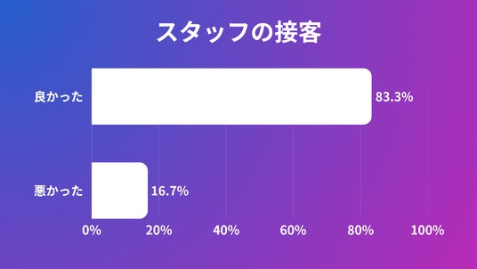 「神対応」 が価値を底上げ: スタッフの接客は83.3%が 「良かった」 と高評価。「おすすめを丁寧に説明してくれた」 など、マニュアルを超えた「心のこもった対応」 が顧客の安心感と満足度を向上させている。
