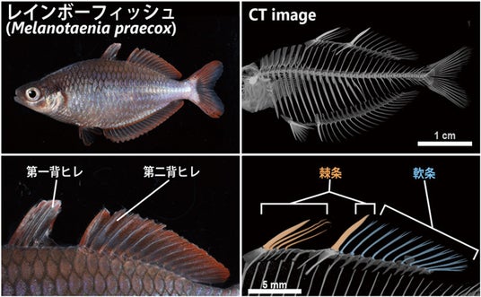 棘条はコバンザメの吸盤・アンコウの釣り竿などの驚くほど多様なかたちに進化しています。本研究では、棘条を持つ「レインボーフィッシュ」を新たなモデル生物として解析しました。