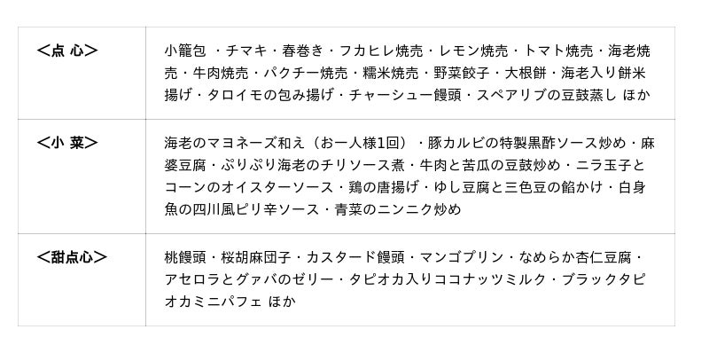 *上記のほか、前菜、中華粥、麺コーナー、6種の中国茶などをご用意しています。お好きなだけお楽しみいただけます。
