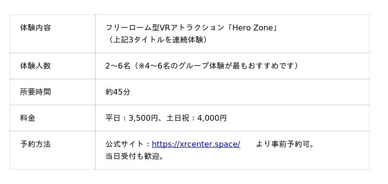 株式会社日本XRセンター(本社:東京都中野区、代表取締役CEO/プロデューサー:小林大河)は、いつもの休日やグループの集まりを劇的に変える新感覚VRアトラクション『Hero Zone』を、直営店舗「XRセンターゲームスペース」にて提供開始いたします。中野ブロードウェイ店(2026年4月25日)、福岡店・キャナルシティ博多(4月27日)で順次オープン予定です。