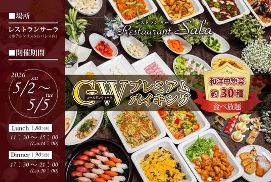 茨城県ひたちなか市の『ホテルクリスタルパレス(茨城県ひたちなか市/副総支配人:神田雅史/客室数:100)』は、2026年5月2日(土)~2026年5月5日(祝火)の期間限定で「ゴールデンウィークプレミアムブッフェ」を開催いたします。アンティパストバーやメインディッシュ、温菜、冷菜、デザート、ドリンクバーなど、和洋中約30品目をご用意。長期連休に、ご家族・ご友人とゆったりお楽しみいただける特別なブッフェです。