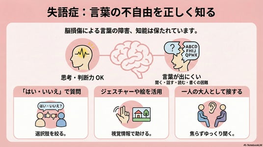 失語症は脳卒中・頭部外傷などの後遺症として発症し、「話す・聞く・読む・書く・計算」に困難をきたす言語障害です。国内患者数は約50万人にのぼりますが、社会的な認知度は依然として低く、「見えない障害」とも呼ばれます。