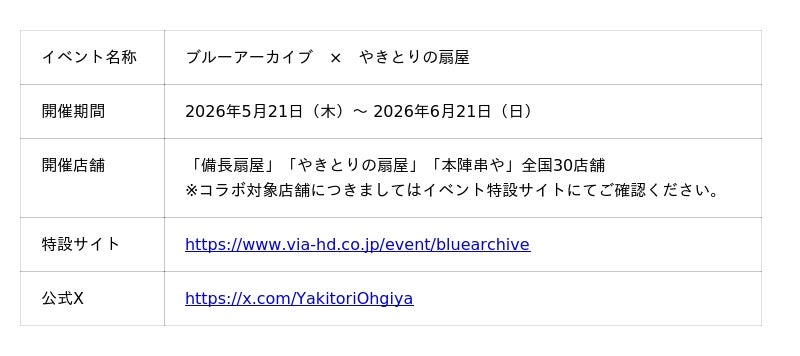 株式会社ヴィア・ホールディングスの子会社である株式会社扇屋東日本・株式会社扇屋西日本(代表取締役:楠元 健一郎)が運営する「やきとりの扇屋」「備長扇屋」「本陣串や」と、アニメやゲーム作品とのコラボ企画及びキャラクターグッズの製造販売を行う株式会社ハイ・シーズン(代表取締役:伊藤敦司)は、スマートフォン向けゲームアプリ『ブルーアーカイブ -Blue Archive-』とのコラボレーション企画を2026年5月21日(木)から2026年6月21日(日)までの期間限定にて開催いたします。