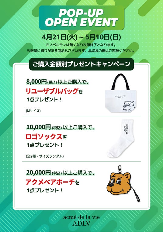 本POP-UPでは、ADLVを象徴するベア(クマ)グラフィックのTシャツ、キャップ、バッグをはじめ、シーズン新作やコラボレーションアイテムを幅広くラインナップ。さらに、ご来店のお客様限定のSNSフォロー&投稿キャンペーンや、ご購入金額に応じたオリジナルノベルティプレゼントなど、ADLVの世界観をたっぷりと体験いただける多彩なキャンペーンを実施いたします。