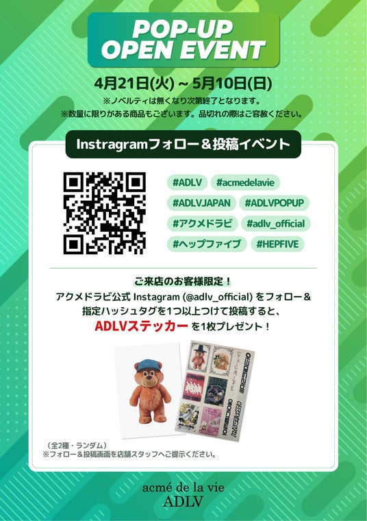 ご来店のお客様限定で、ADLV公式Instagram(@adlv_official)をフォローのうえ、指定ハッシュタグのいずれかを1つ以上付けてSNSに投稿いただいた方に、ADLVオリジナルステッカー(全2種・ランダム)を1枚プレゼントいたします。