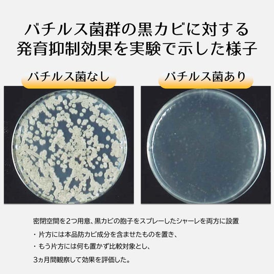 弊社商品のカビを抑えるビーズの秘密は、バイオベンチャーが開発に成功したバチルス菌技術です。バチルス菌は天然由来の成分で作られており、水と反応すると覚醒し、カビ菌を抑制し長く効果を出し続けます。