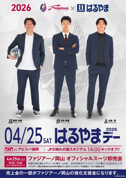 ビジネスパーソンの健康を応援・サポートする、はるやま商事株式会社(本社:岡山県岡山市、代表取締役会長兼社長:治山正史)は、岡山県をホームタウンとして活躍するJ1リーグ所属クラブ「ファジアーノ岡山」が掲げる「子どもたちに夢を!」というクラブ理念に賛同し、2007年より10年以上クラブスポンサーとしてサポートし、オフィシャルスーツを提供しております。この度、2026年4月25日(土)に開催されるホームゲームにて「はるやまデー」を実施し、選手と同じ素材・デザインのオフィシャルスーツをスタジアムにて販売する即売会を開催いたします。
