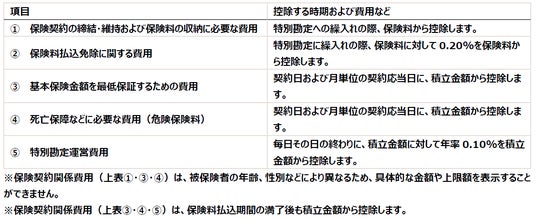 保険契約関係費用とは、お払込みいただいた保険料もしくは積立金から控除される諸費用のことをいいます。保険契約関係費用の詳細は下表のとおりです。