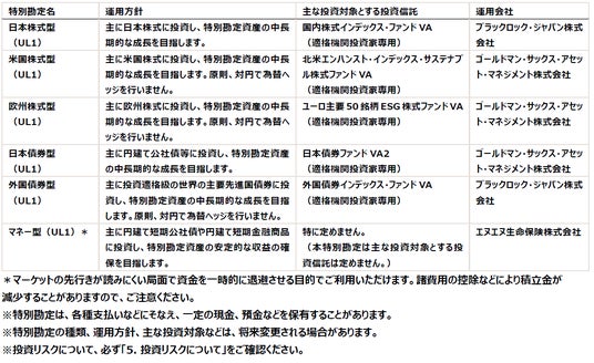 - インフレ時代に備えやすいしくみ日本・米国・欧州の株式や日本・外国債券など6種類の特別勘定から運用対象を選択でき、お客さまのリスク許容度に応じポートフォリオは株式比率0%から100%まで設定可能です。物価上昇局面でも、保障価値の目減りに備えやすい設計です。