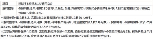 解約・減額をされる場合、その書類を受付けた日*の翌営業日における保険料払込年月数が10年未満の場合、以下の費用がかかります。