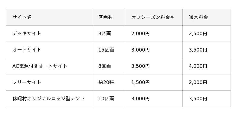 ※オフシーズン料金適用日は休暇村庄内羽黒キャンプ場HPよりご確認ください。
