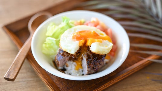 シェフが鉄板で仕上げるガーリックライスに、目玉焼きやハンバーグをのせて。食べ応え抜群のローカルフードです。