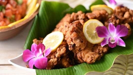 ロコモコ丼 / 瀬戸内六穀豚のロースト スパイス香るポリネシアンソース / ハワイアントロピカルピザ / スペアリブと豚バラ肉の煮込み トロピカル風 / ロミロミサーモン / モチコチキン唐揚げ / クラムチャウダー byプリンスワイキキ /マラサダ / レインボーシェイブアイス など