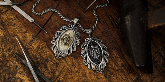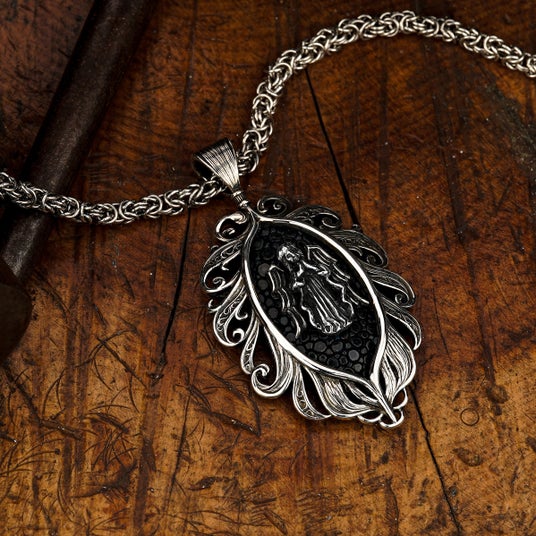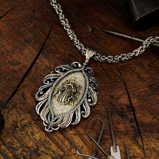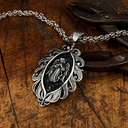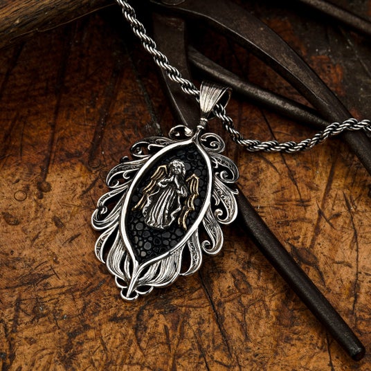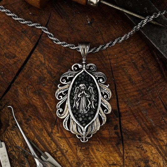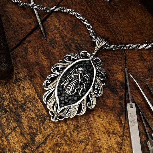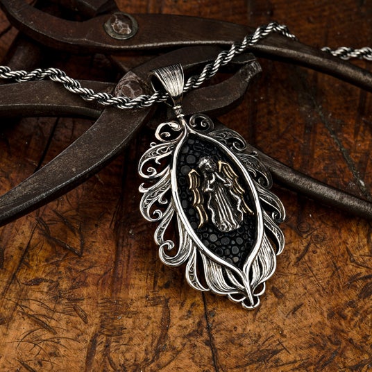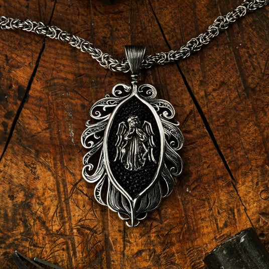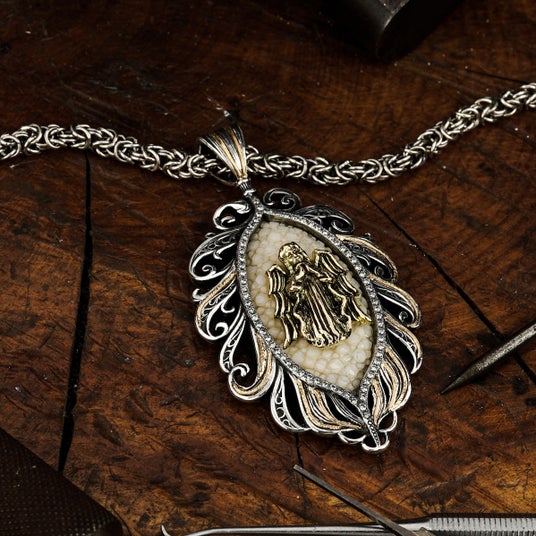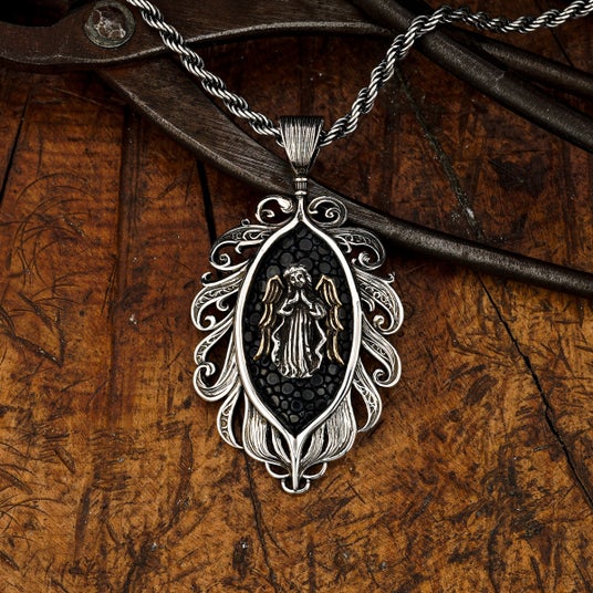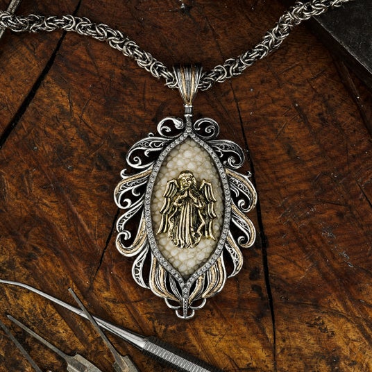 天使から舞い降りた羽根に抱擁される姿を表現した繊細さと優雅さを併せ持つアイテムとして制作されたペンダント。中央には祈りを捧げる天使の姿がデザインされており、着用するものに神のご加護が訪れますようにという願いが込められている。