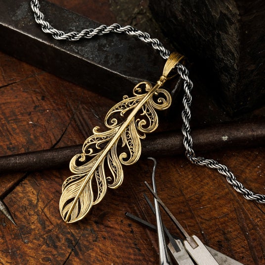 羽根を透かし彫りのシルエットを用いて表現。中世ヨーロッパの装飾を想わせるようなスクロール柄を取り入れたペンダント。天使が羽ばたいた際に軽やかに舞う羽根をイメージし、空を優雅に漂いながら舞い降りてく雰囲気に仕上げられている。