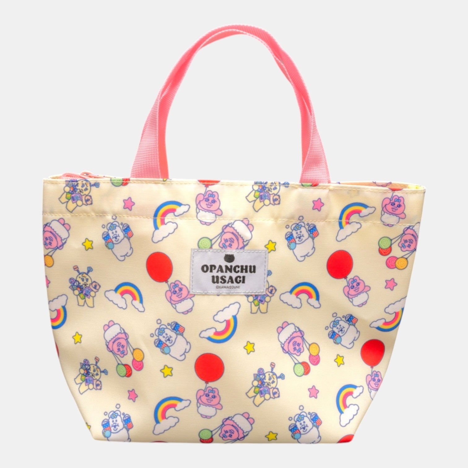 「おぱんちゅうさぎ」のキュートな姿が描かれた、ランチタイムや日々のお買い物に活躍する保冷バッグやペットボトルケースなど全5アイテムが登場します。