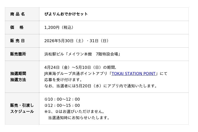ジェイアール東海フードサービス株式会社(本社:愛知県名古屋市、代表取締役社長:岩下賢一)が展開するオリジナルスイーツ「ぴよりん」は、浜松ターミナル開発株式会社(本社:静岡県浜松市)が運営する「浜松駅ビル メイワン」の開業38周年記念および「ぴよりん」誕生15周年記念企画の一環として、2026年5月30日(土)・31日(日)の2日間、同施設7階特設会場にて数量限定で販売されます。なお、販売は「TOKAI STATION POINT」アプリによる事前抽選方式で実施します。