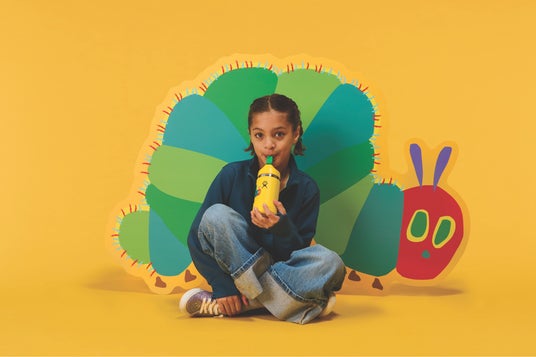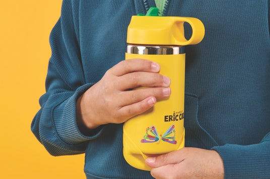 絵本の世界観をそのまま体験できるような、ワクワクする特別仕様です。ビビッドなイエローのボトルに、アイコニックなグリーンカラーのストローを合わせました。