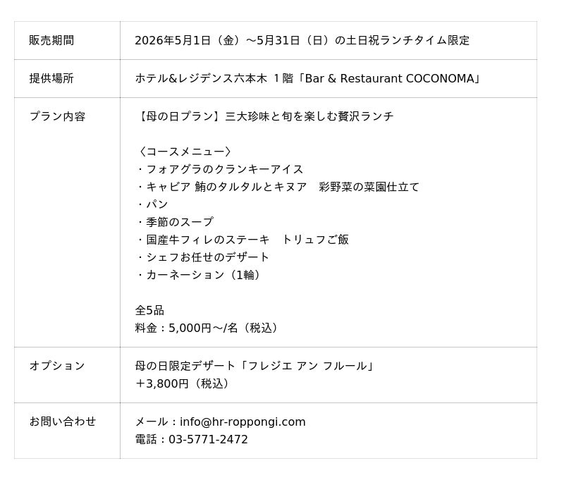シマダハウス株式会社(東京都渋谷区、代表:島田一成)が運営するホテル&レジデンス六本木(東京都港区西麻布)では、同施設1階のBar & Restaurant COCONOMA(バー・アンド・レストラン・ココノマ)にて、母の日の特別なケーキ「フレジエ アン フルール」を、週末のランチタイム限定で提供いたします。