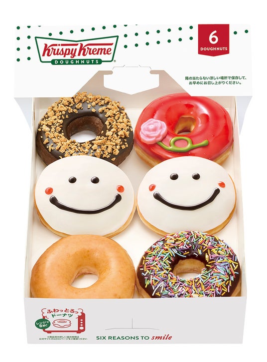 2つの新商品に加え、人気No.1の『オリジナル・グレーズド(R)』と、お子さまにも人気の『チョココート スプリンクル』、チョコ生地にビターチョコとアーモンドクランチをトッピングした『ダブル チョコ クランチ』を組み合わせた『ママ ダズン ハーフ(6個)』も期間限定で販売します。中央にスマイルドーナツを2つ並べた、ボックスを開けた瞬間に笑顔が広がる、母の日のギフトにもぴったりなボックスです。