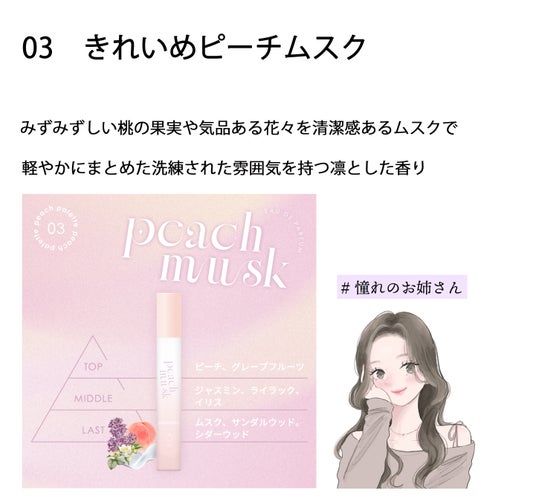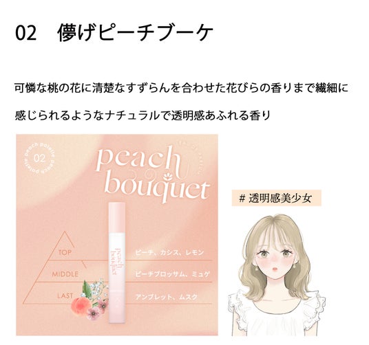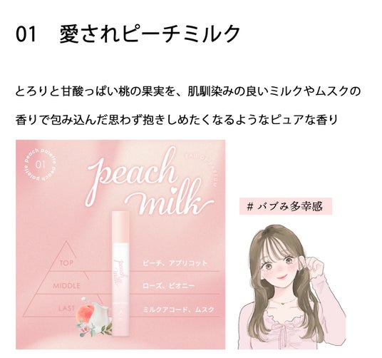 自分らしさやその日のファッション、なりたい姿に合わせて、繊細なニュアンスの違いを使い分けられる「ピーチの香り」のコレクションです。