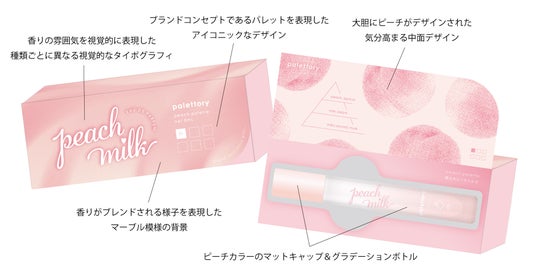 デザインは、ブランドコンセプトを体現したメイクパレットのように開くパッケージに、ピーチの質感を感じるマット加工を施したピンクのキャップとボトル。香りごとに異なるフォントを採用し、その世界観を視覚でも表現しました。