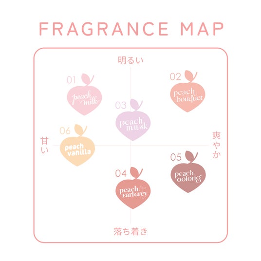 展開する桃の香りは全部で6種類。「ピーチ×ミルク」「ピーチ×ブーケ」といった組み合わせに加え、製品名には「あざとピーチバニラ」「お上品ピーチアールグレイ」など、香りの印象をプラスしました。