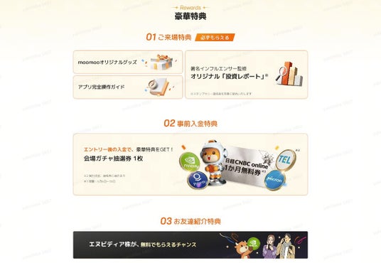 キャンペーン応募後の入金額に応じて「米国の人気AI関連銘柄(買付代金)」や「日経CNBC online 1か月無料券」、「オリジナルムームーグッズ」などがもらえます。