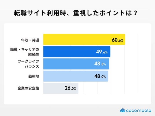 - 転職時に重視した点は「年収・待遇」(60.6%)が圧倒的トップで、次いでキャリアの継続性(49.6%)、ワークライフバランス(48.8%)。また、年収は「上がった」40.2%に対し「下がった」14.2%と、転職によって収入が改善した人も一定数いることがわかった。