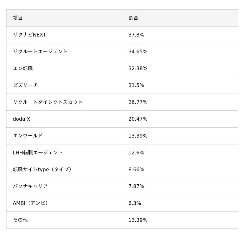 - 利用転職サイトは「リクナビNEXT」(37.8%)が最多で、次いでリクルートエージェント(34.7%)、エン転職(32.3%)と続いた。メイン利用でもリクナビNEXTが最多(19.7%)となり、求人媒体+エージェントの併用が主流となっている。
