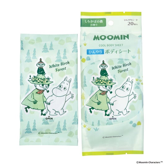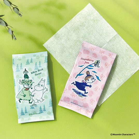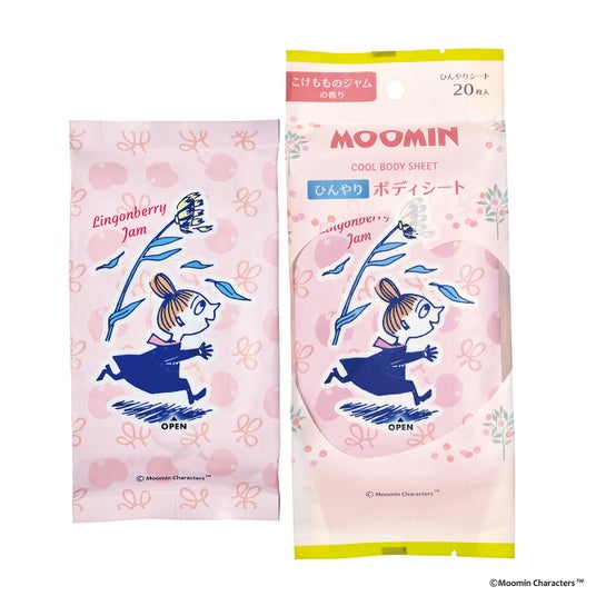 「氷冷タオル」は30×60cmの首にかけられる大判サイズ。清涼成分メントール配合で屋外での暑さ対策におすすめです。「ひんやりボディーシート」はムーミン谷をイメージした「しらかばの森」と「こけもものジャム」がふんわりと香り、やわらか厚手シートで汗やベタつきをしっかり拭き取ります。