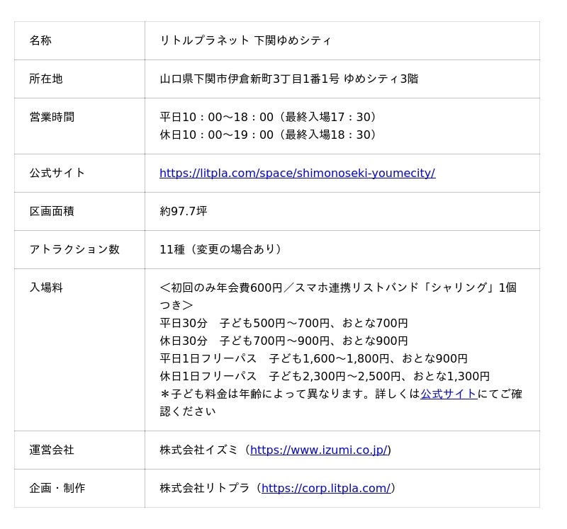 “遊びが学びに変わる”がコンセプトの次世代型テーマパーク「リトルプラネット」を国内外に展開する株式会社リトプラ(東京都港区、代表取締役CEO:後藤 貴史)は、山口県へは初出店、中国地方では3店舗目となる常設パーク「リトルプラネット 下関ゆめシティ」を2026年6月19日(金)にオープンいたします。