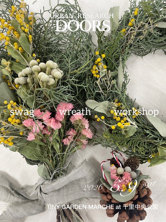 市場で見つけたさまざまな種類のお花や、店舗装飾での役目を終えた植物をドライにしてご用意。お好きなチョイスでスワッグやリース作りを体験していただけます。お子様も作りやすいミニスワッグやオーナメントも。