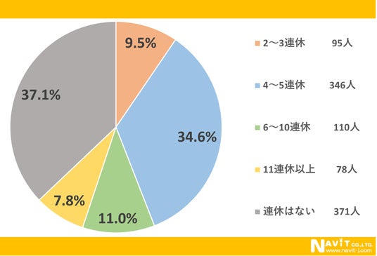 「今年のゴールデンウィークは何連休の予定ですか?」という質問については、「4~5連休」が34.6%、「6~10連休」が11.0%、「2~3連休」が9.5%という順になりました。一方、「11連休以上」という方も7.8%いらっしゃいましたよ。全体で見ると、暦通りの休日数の方が多いのかもしれませんね。
