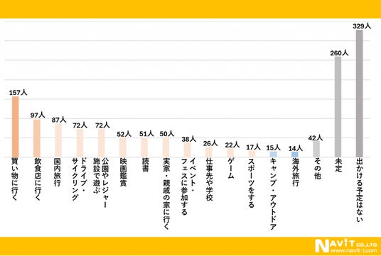 「今年のゴールデンウィークは何をしに出かけますか?」という質問を複数選択可で行ったところ、「買い物に行く」が157人、「飲食店に行く」が97人、「国内旅行」が87人という順になりました。