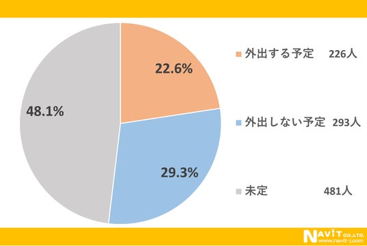 「今年のゴールデンウィークに外出する予定はありますか?」という質問については、「外出する予定」が22.6%、「外出しない予定」が29.3%、「未定」が48.1%という順になりました。