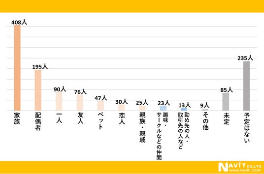 「今年のゴールデンウィークは誰と過ごす予定ですか?」という質問を複数回答可で行ったところ、「家族」が408人、「配偶者」が195人、「一人」が90人という順になりました。家族で過ごす人が多いようですね。
